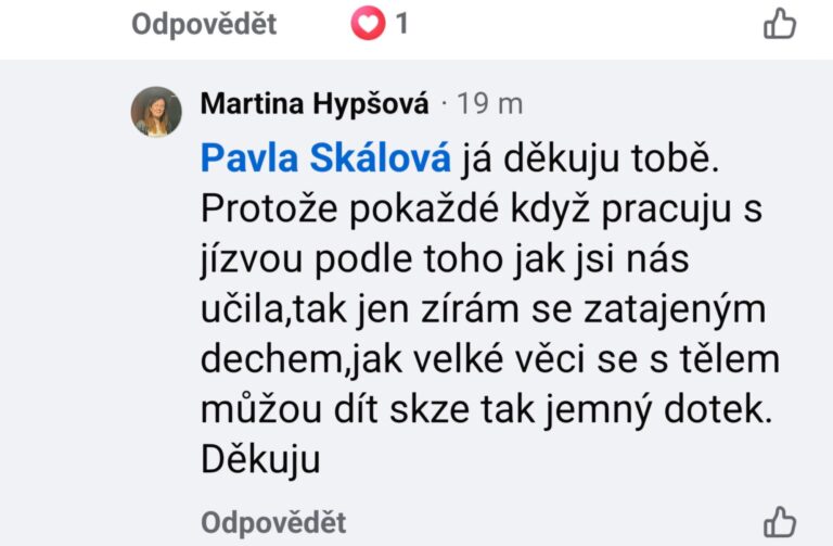 Kurz Péče o Jizvy byl naprosto skvělý. Dozvěděla jsem se velmi zajímavé a důležité informace i spojitosti. Paní Pavla je úžasná bytost a v jejím podání byl kurz skutečně plně prožitým dnem v lásce a péči. Děkuji a budu se těšit na další Pavlin kurz ve Třezalce.